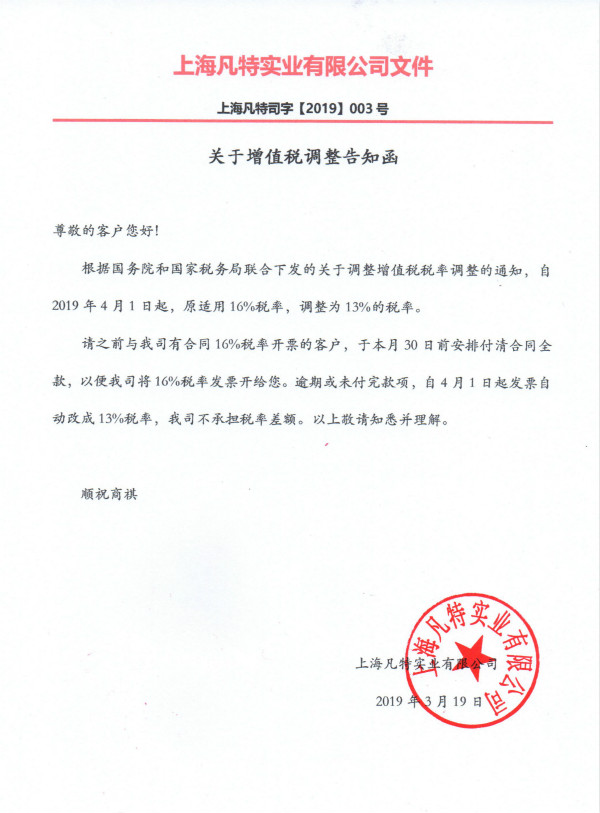 請之前與我司有合同16%稅率開票的客戶,于本月30日前安排付清合同全款,以便我司將16%稅率發(fā)票開給您。逾期或未付完款項(xiàng),自4月1日起發(fā)票自動改成13%稅率,我司不承擔(dān)稅率差額。以上敬請知悉并理解。