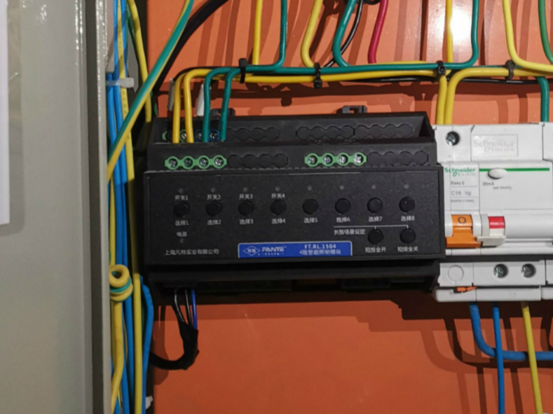 該智能照明控制系統(tǒng)項目采用的是經(jīng)濟型4路、8路智能照明模塊以及485有源集線器,均安裝在電箱內(nèi),導(dǎo)軌安裝。