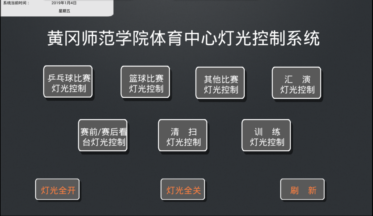 VSU為黃岡師范學(xué)院體育中心實(shí)現(xiàn)燈光智能化控制,多種燈光場(chǎng)景模式任意切換,一鍵開(kāi)閉館內(nèi)所有燈具。我司根據(jù)客戶需求設(shè)置了以下燈光場(chǎng)景模式:乒乓球比賽、籃球比賽、其他比賽、匯演、賽前/賽后、清掃、訓(xùn)練、全開(kāi)、全關(guān)。